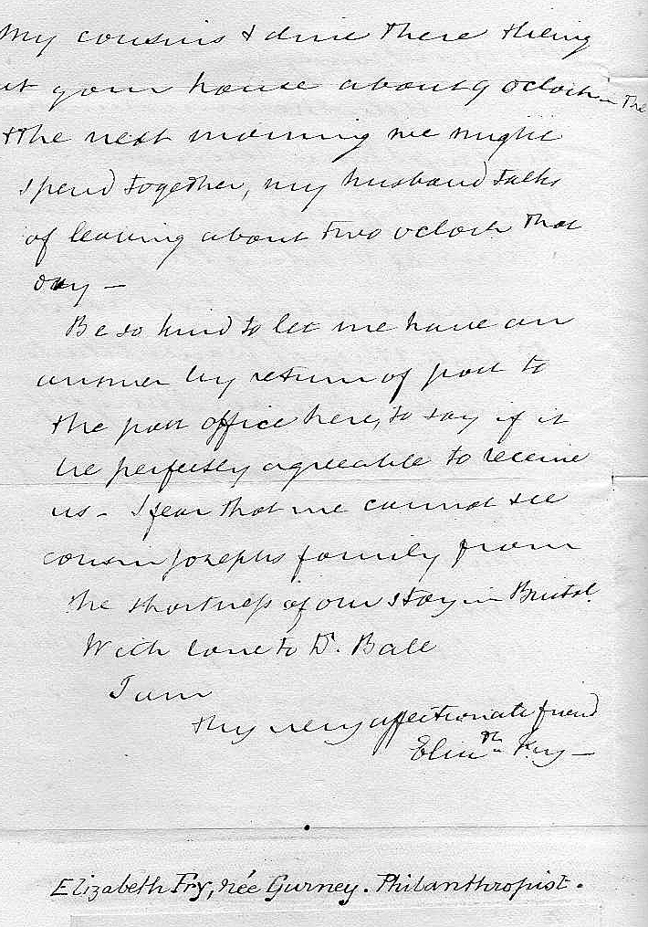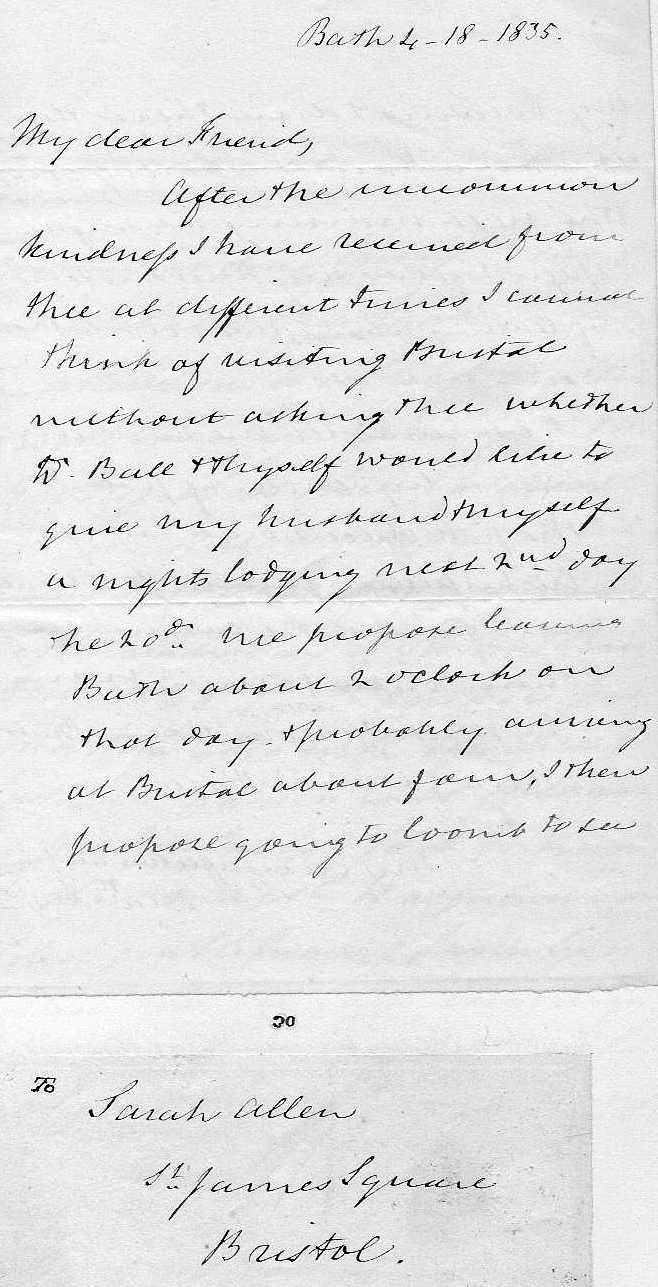 The following letter was written by Elizabeth, asking if Sarah Allen, of Bristol, could put her up for a few days...