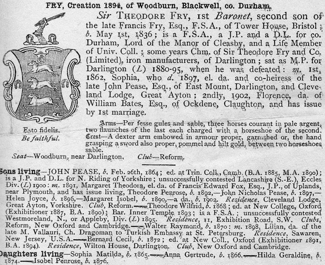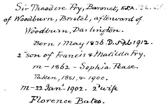 Theodore Fry (later Mayor and M.P. of the town of Darlington 1850-1895) and his Quaker wife Sophie Pease Fry (granddaughter of Edward Pease, the noted woollen manufacturer and promoter of the pioneering Stockton to Darlington Railway). Members of the Fry family lived in Woodburn Mansion, formerly situated on the south side of Coniscliffe Road, Darlington.