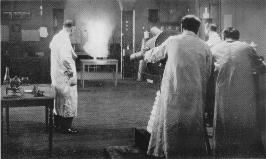 Harry was experimenting with electrically charged light beams that he claimed could stop an aeroplane’s engine, explode gunpowder or kill a mouse. During experiments it was not unusual for a passing technician to be knocked out or burned while passing close to the beam. He claimed to have himself lost the use of one eye during these experiments. << Left: Harry's Death Ray in action. |