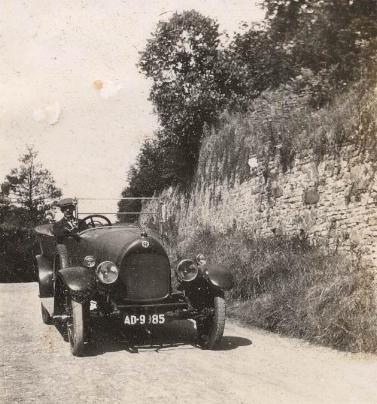 Owner of the Flock Mill, Frenchay, trying out his new car on Pearces Hill, Frenchay.