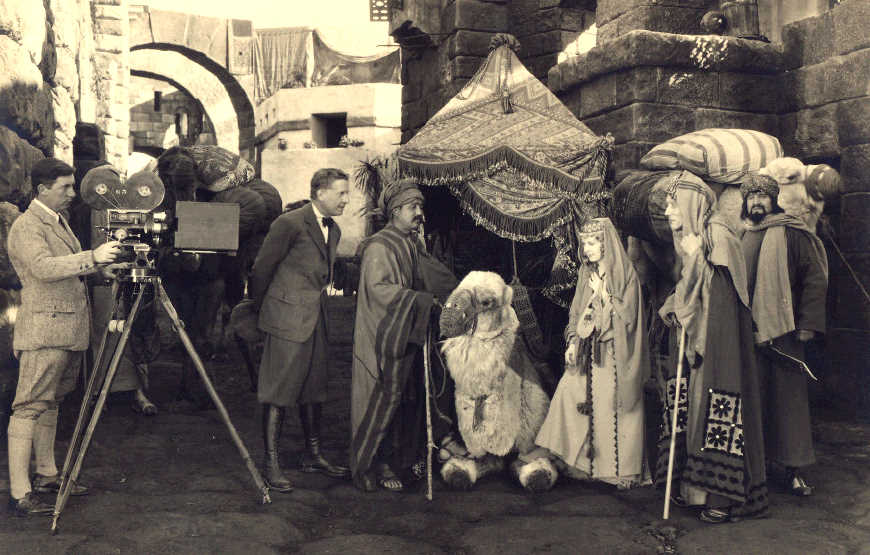This particularly interesting shot shows the Director Fred Niblo, the cameraman and camera, and a stuffed camel in the centre. The lady is May McAvoy and the gentleman to the right of her, with the squared flower pattern on his robes, is Francis George Packer. |