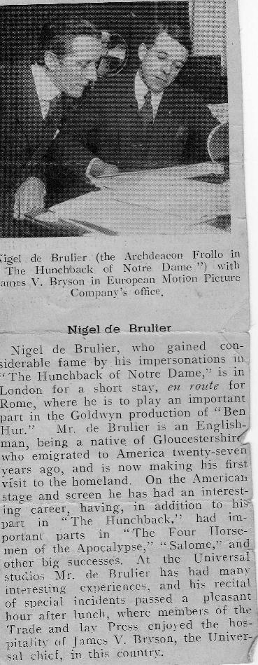 Francis George Packers Hollywood Biography, downloaded from the InterNet, reads as follows Nigel De Brulier. Height 5-8". Character actor in Hollywood silents and talkies. British-born Nigel De Bruliers long career began in silent films, but unlike many performers of the era, he managed to successfully translate into sound films. His authoritarian and somewhat regal bearing was perfect for the many Bishops, Cardinals, Knights and other authority figures he often played. He portrayed Cardinal Richelieu in both the 1921 and 1935 versions of The Three Musketeers.