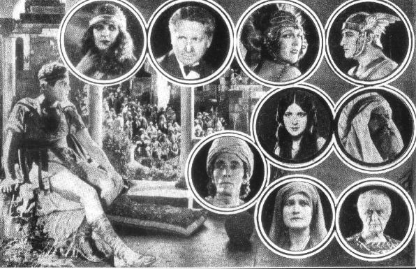 In this publicity postcard, Francis is seen in the centre, wearing a turban. The wording on the reverse side reads ROMA Magnificent vista of Jerusalem, one of the many colourful and dramatic scenes filmed by Director Fred Niblo for the Metro-Goldwin-Mayer spectacular production of General Lew Wallaces famous novel and stage play, Ben Hur. Prominent in the celebrated cast of screen players are: Ramon Navarro [Ben Hur], May McAvoy [Esther], Carmel Myers [Iras], Francis X Bushman [Messala], Kathleen Key, Nigel De Brulier [Simonides], Claire McDowell [Princess of Hur], Frank Currier [ Quintas Arrius], and Anders Randolf. |