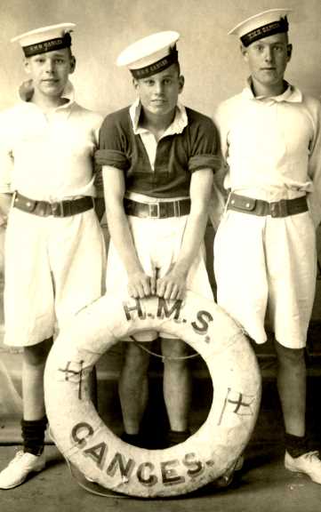 Circa 1936, Jack joined the Royal Navy and trained at HMS Ganges, near Ipswich, Suffolk. [Follow the above link to see some excellent pictures of HMS Ganges] It is said that he was destined for an exemplary career, but he died on 12 October 1938 at the early age of 20, suffering from a rare form of cancer. Jack is seen here in the centre of the picture, c1937. [This really is a fine photograph. Does anyone recognise the other two young men?] |