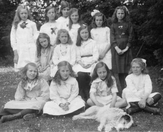 Back row, left to right... Hilda Fidler; B Baker; L Clifford; Gladys Fidler; W Upton; Kathleen Wallace. Centre row... A Tucker; Ethel Kathleen Baber; I Green. Front row... W Ford; Edith Wallace; W Green; R Bennett, Not quite asleep... the dog. |