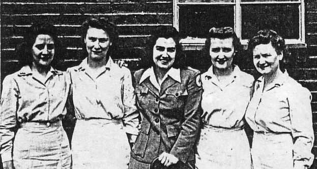 ![]() Red Cross Unit at the Frenchay US Hospital Left to right: Betty Humann, Catherine Caveny, Lois White, Evelyn Harwood & Carol Pulciver. |